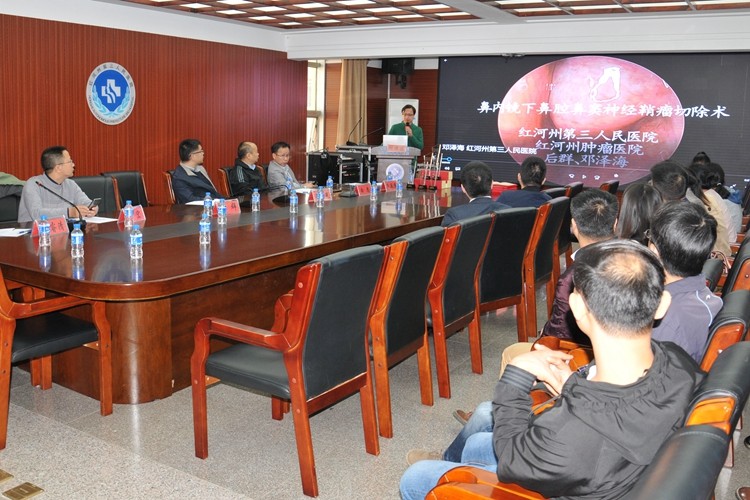 2019年9月27日,云南省医师协会耳鼻咽喉科医师分会青年委员会在位于锡都个旧的红河州第三人民医院、红河州肿瘤医院正式成立,翌日,即开展了云南省医师协会耳鼻咽喉科医师分会首届青年医师手术视频大赛,由后群、白忠、 余宏、周亚光、刘睿清5位专家担任评委,红河州第三人民医院邓泽海的“鼻内镜下鼻腔鼻窦神经鞘瘤切除术”、昆明医科大学第二附属医院吕操的“30度内镜下鼻中隔入路垂体瘤手术”、蒙自市人民医院付云龙的“鼻内镜下腺样体切除术”、昆明市延安医院徐昕的“显微镜下CO2激光双侧室带小结切除术”、个旧市人民医院苏丹的“鼻内镜下内翻性乳头状瘤切除术”、 红河州第一人民医院周莹的“ 鼻内镜下鼻窦手术”、昆明市同仁医院杨晓东的“支撑喉镜下声带息肉CO2激光切除术”、文山州人民医院李强的“鼻内镜下额窦囊肿切除术”、昆明市儿童医院高燕的“扁桃体腺样体切除术”,以及昆明医科大学第一附医院龙瑞清的“开放式乳突根治+自体耳甲腔软骨听骨链重建”、云南省第一人民医院管燕飞的环状软骨-舌骨-会厌吻合术等,参加了这次手术视频大赛。