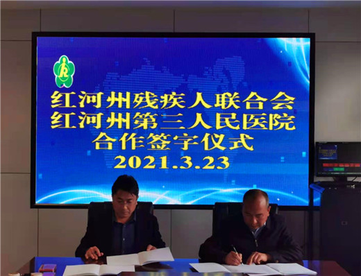 为更好地为残疾人提供康复服务,体现党和政府以人民为中心、关爱弱势群体、构建和谐社会的理念,填补红河州没有残疾人康复医院的空白,2021年3月23日上午,红河州第三人民医院党委副书记、院长杨连升与红河州残疾人联合会残联党组书记、理事长李光林签订合作协议,共同合作运营红河州残疾人康复中心,为视力、听力、言语、肢体、精神、智力残疾以及其他功能障碍的人员提供专业康复服务。