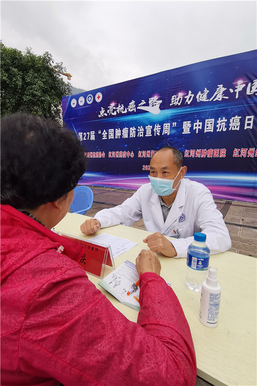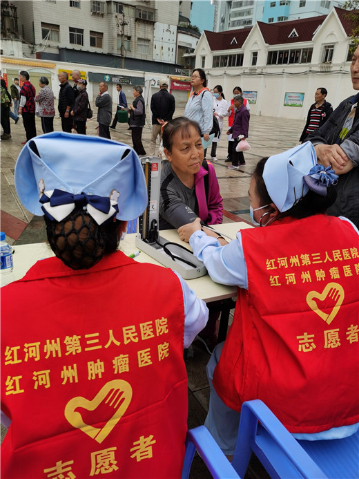 2021年4月17日,红河州第三人民医院、红河州肿瘤医院,在个旧市工人文化宫开展“第27届全国肿瘤防治宣传周暨中国抗癌日”大型义诊,此次宣传周主题为“点亮抗癌之路,助力健康中国”,当天,累计发放各类肿瘤防治宣传资料9000多份,为群众义诊2000多人次。